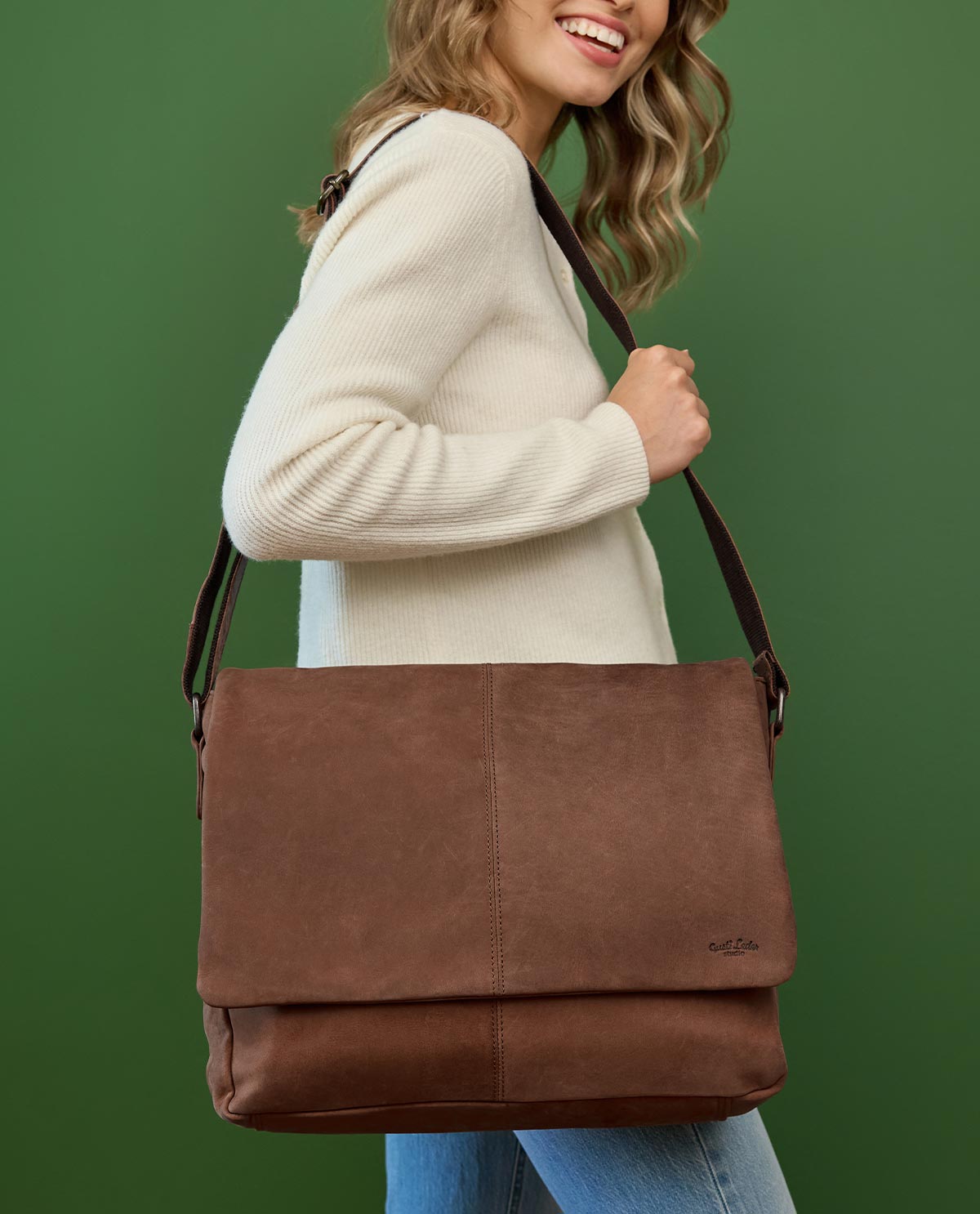 Vores skuldertaske er fremstillet af højkvalitets, robust læder. Det slidstærke materiale får mere karakter med tiden og udvikler en unik patina. Hver taske er håndlavet og har sine egne individuelle egenskaber, hvilket gør den til et unikt eksemplar. Den brune farve giver tasken et autentisk vintage-look, der passer perfekt til ethvert outfit. Desuden tilbyder tasken rigelig opbevaringsplads: Et hovedrum er stort nok til en tablet, en bærbar computer eller vigtige dokumenter. To indvendige rum og en lynlåslomme sørger for orden, mens den justerbare skulderrem sikrer optimal bærekomfort – uanset om den bæres afslappet over skulderen eller på tværs af kroppen.