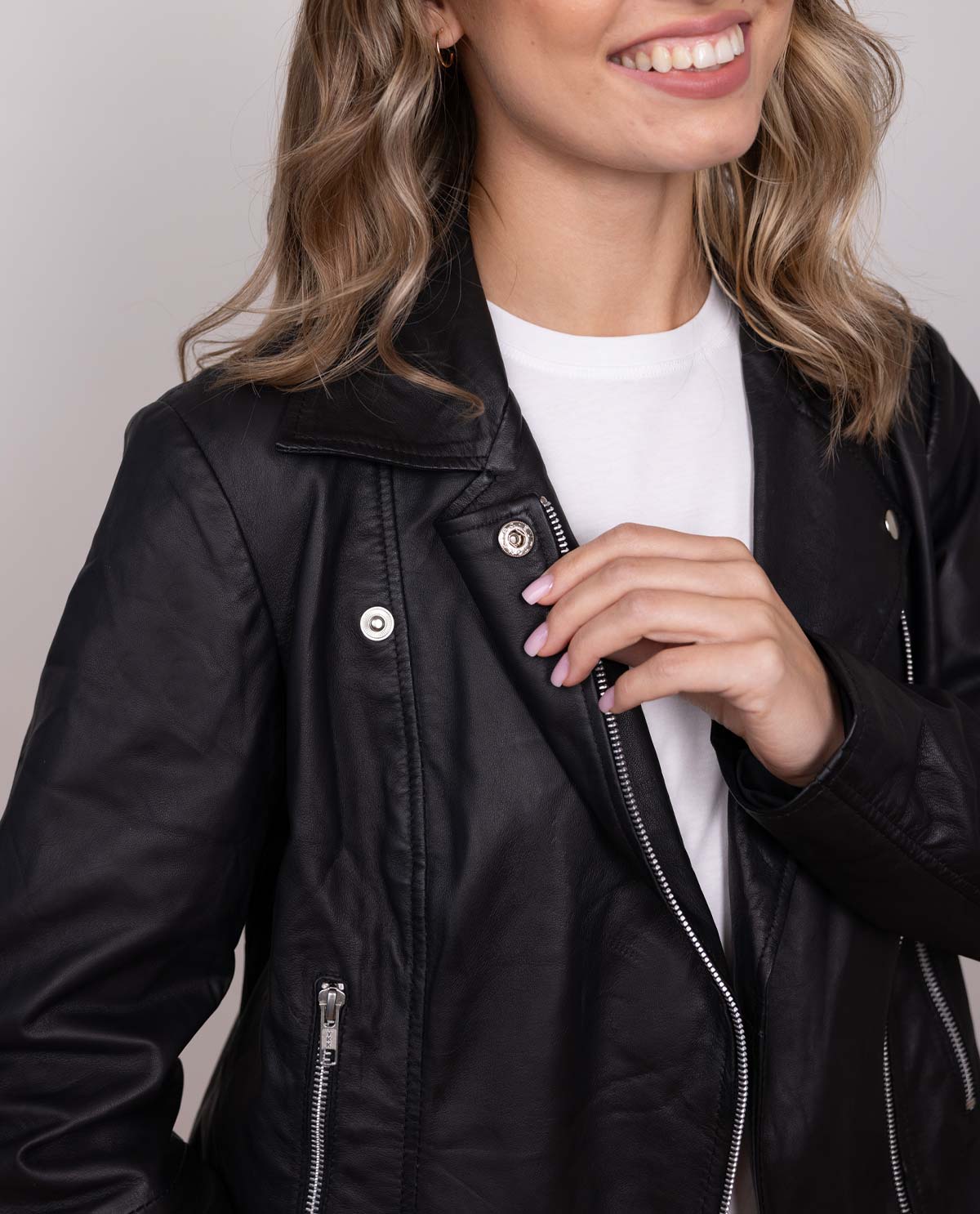 En klassiker med et moderne touch – bikerjakken „Ova“ i sort ægte læder giver dit outfit en markant, stilfuld udstråling. Uanset om du kombinerer den med jeans og støvler eller bærer den over en kjole, sætter denne læderjakke et modeudtryk. Det højkvalitets læder føles behageligt blødt og udvikler med tiden en individuel patina – lige så unik som dig.
