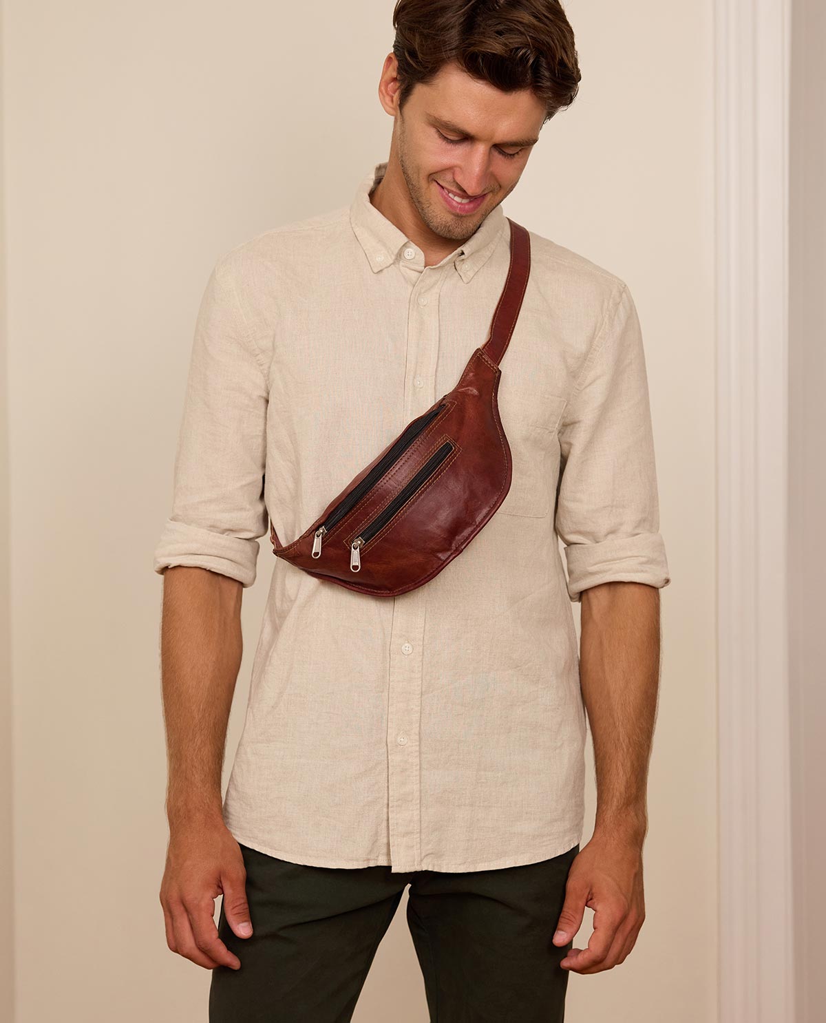Klassisk elegant med et strejf af usædvanlighed og individualitet, kombineret med praktisk håndtering og masser af plads til dine vigtigste ting. Det lyder næsten for godt til at være sandt, men "Richard" giver dig netop det! Bæltetasken er lavet af naturligt garvet, blødt gedelæder, der med sin fleksibilitet perfekt kan tilpasses dine behov. Erfarne festivalgængere vil snart værdsætte "Richards" kvaliteter, og ingen koncert vil blive besøgt uden den. Det store hovedrum giver nok plads til mobiltelefon, diverse småting og endda en bog, hvis din yndlingskunstner igen tager længere tid om at komme på scenen. I det forreste lille rum kan du opbevare ørepropper og pengesedler. Så er alt altid lige ved hånden. Lynlåse sikrer, at penge, mobil og nøgler ikke bare bliver væk og holder langfingrede personer væk. Med den længdejusterbare bærestrop tilpasser "Richard" sig altid til dig. I det trendy vintage-look og med sin naturlige udstråling er "Richard" simpelthen perfekt.