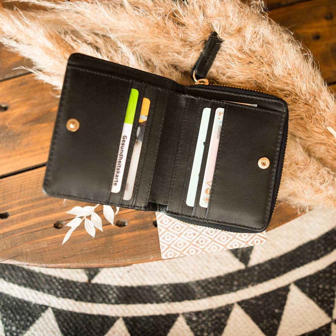 Indvendigt har „Monika“ et stort møntrum med to rum, så du kan få mest mulig plads. Højdepunkterne er dog det foldbare kortfag med plads til op til 8 kort samt indsatsrum til dine pengesedler. Den store lynlås beskytter dine ejendele perfekt, så intet kan falde ud. Ned i tasken og afsted - med „Monika“!