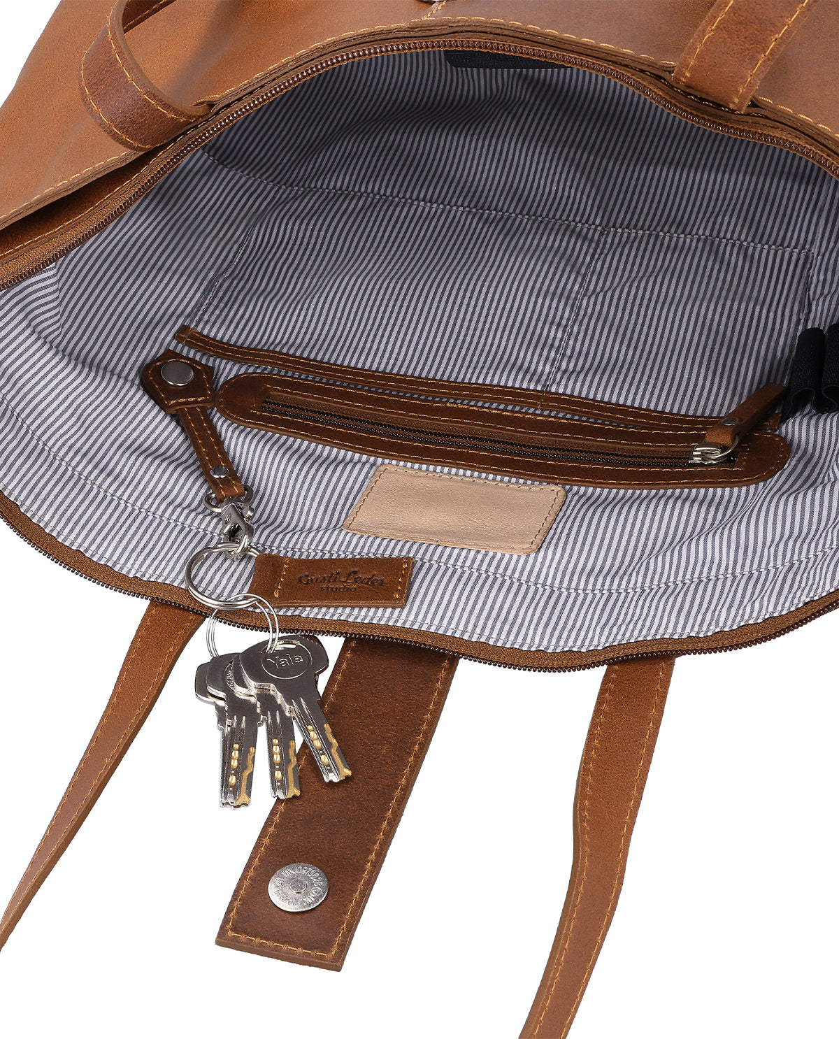 De praktiske indvendige lommer giver mulighed for nemt at opbevare småting som mobil og nøgler og have dem lige ved hånden uden at skulle gennemsøge hele tasken. "Alexandra" tilbyder plads til enheder op til 15", mapper, tegnebog, makeup og indkøb – simpelthen alt, hvad du har brug for. Med sin unikke størrelse og det stærke læder er den ikke kun en praktisk, men også en stilfuld følgesvend til ethvert eventyr, dagen måtte bringe.