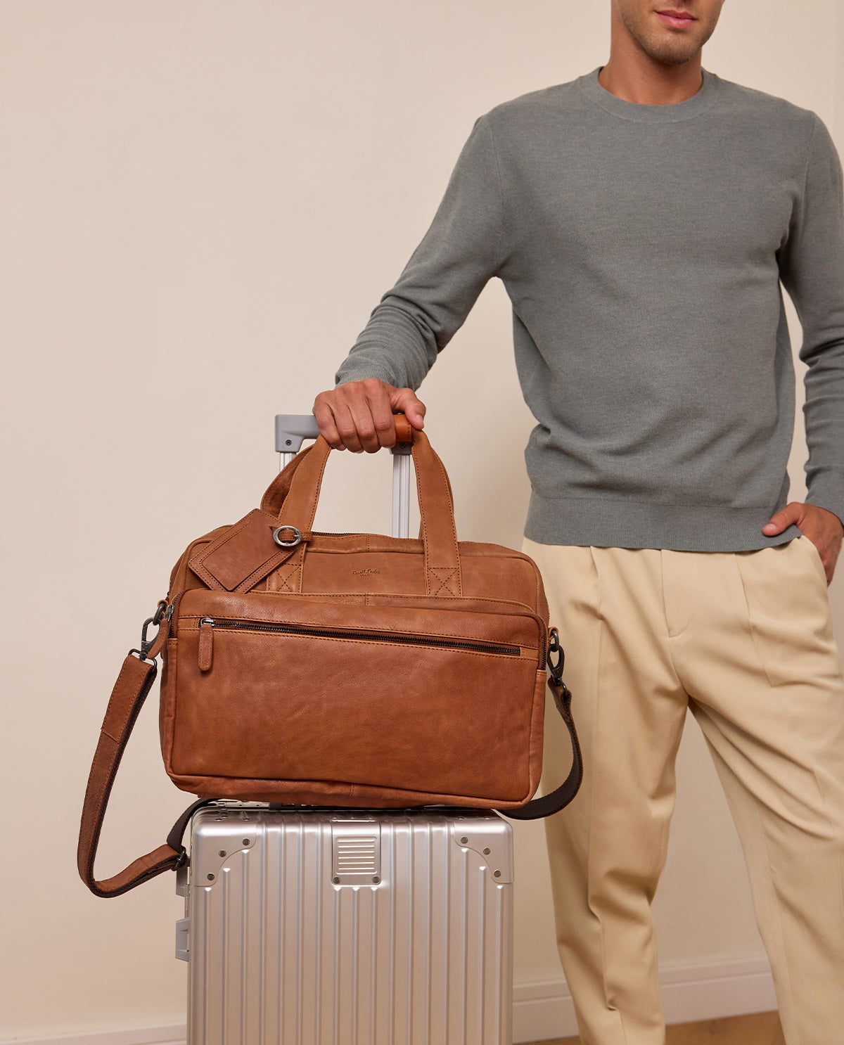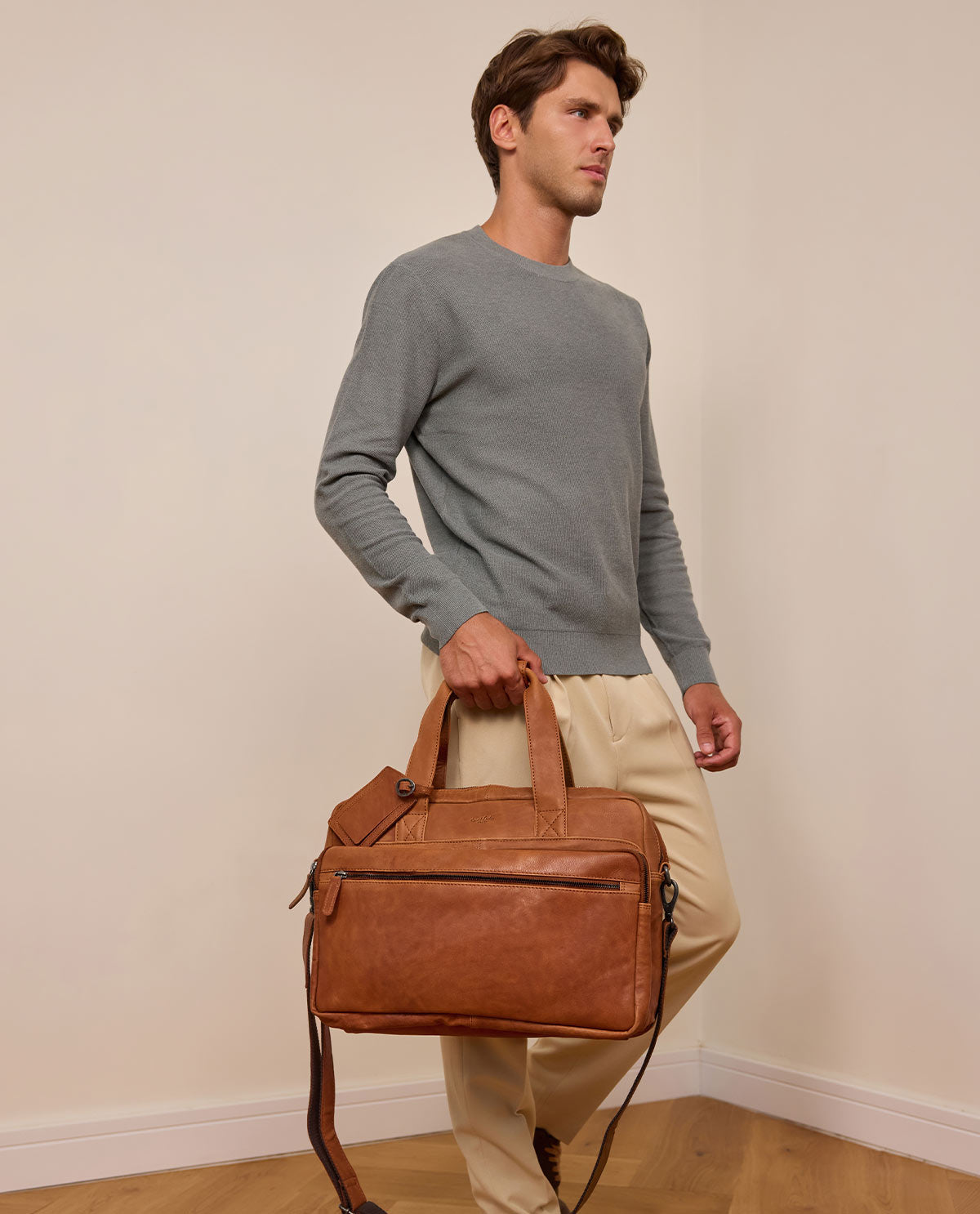 "Alvaro" er den perfekte forretningstaske for alle, der ønsker at kombinere elegance med funktionalitet. Lavet af høj kvalitet brunt læder, giver den dit look et tidløst og professionelt præg. Med gennemtænkt design og generøs opbevaringsplads er den ideel som arbejdstaske til møder, rejser eller hverdagen på kontoret. Takket være de dobbelte lynlåslommer har du altid overblik over dine dokumenter og arbejdsredskaber.