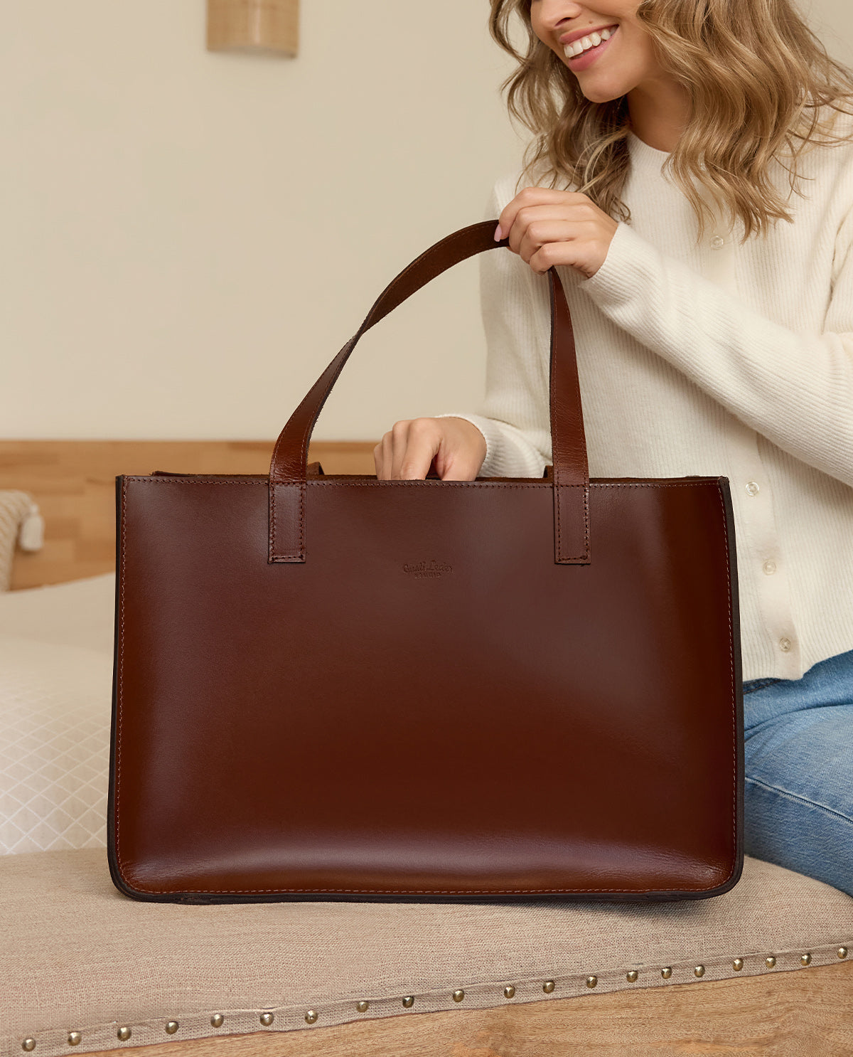 Det ekstra store indvendige rum i Agatha har nok plads til din 15 tommer bærbare, din drikkedunk, pung, notesbøger, nøgler og penalhus. Desuden tilbyder den store åbning nok opbevaringsplads til en spontan indkøbstur. Bærehåndtagene af ægte læder fuldender designet, mens muligheden for at personliggøre Agatha med en dedikation gør den til en særlig personlig gave. Denne taske vil ikke kun opfylde din hverdag, men også støtte en branche, der arbejder for miljøbeskyttelse og fair arbejdspraksis. Et must-have for alle, der ønsker at forene funktionalitet og stil.