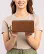 "Cara" er den perfekte pung til alle, der søger en stilfuld og samtidig praktisk løsning til deres økonomi. Fremstillet af høj kvalitet brunt læder, imponerer den ikke kun med sit ædle udseende, men også med sin fremragende forarbejdning. Med en omløbende lynlås og et andet lynlåsfag tilbyder den sikker opbevaring til dine kontanter og værdigenstande. Denne pung sørger for orden og giver dig rigelig plads til alle dine essentielle ting.