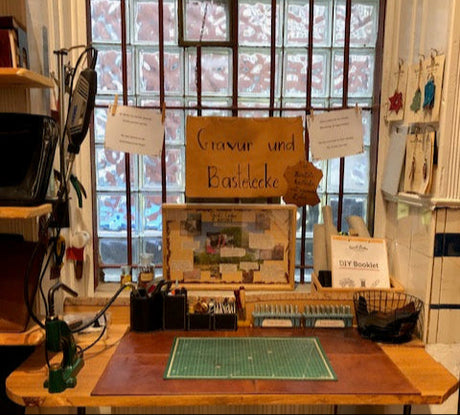 Unser Laden bietet eine kostenlose Gelegenheit kreativ zu werden. So kannst Du z.B. Deine gekauften Taschen hier direkt selbst personalisieren und mit einer Gravur versehen. Außerdem kannst aus Lederresten z.B. kleine Anhänger basteln. Die Lederreste stammen dabei von alten unverkäuflichen Taschen. Nachhaltigkeit ist ein elementarer Gedanke unseres täglichen Handelns.