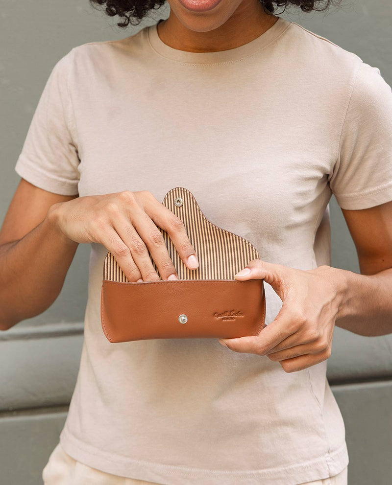 Mit „Cornelius“ bewahrst Du Deine Brille sicher und stilvoll auf. Dieses edle Brillenetui aus hochwertigem braunem Leder vereint Schutz und Eleganz in einem zeitlosen Design. Die robuste Verarbeitung sorgt dafür, dass Deine Brille vor Kratzern und äußeren Einflüssen bestens geschützt ist. Dank der kompakten Form passt „Cornelius“ mühelos in jede Tasche und ist damit der perfekte Begleiter für unterwegs. Ob für den Alltag, auf Reisen oder im Büro – dieses Etui ist ideal für Frauen und Herren, die auf stilvolle Funktionalität setzen.
