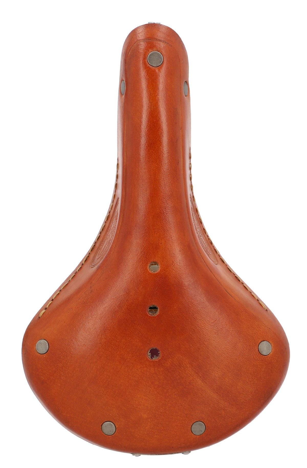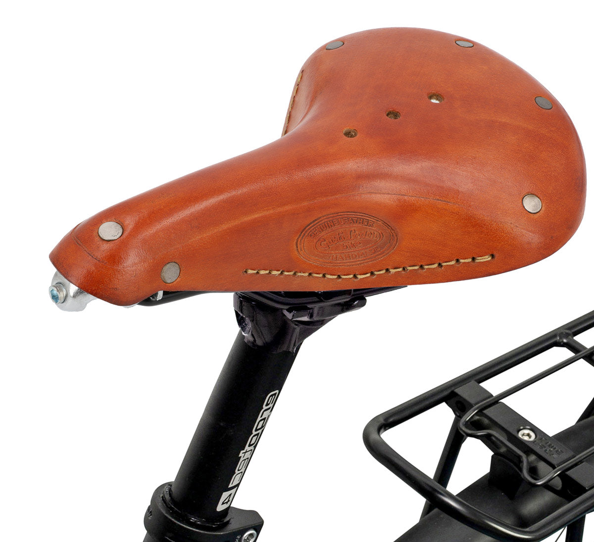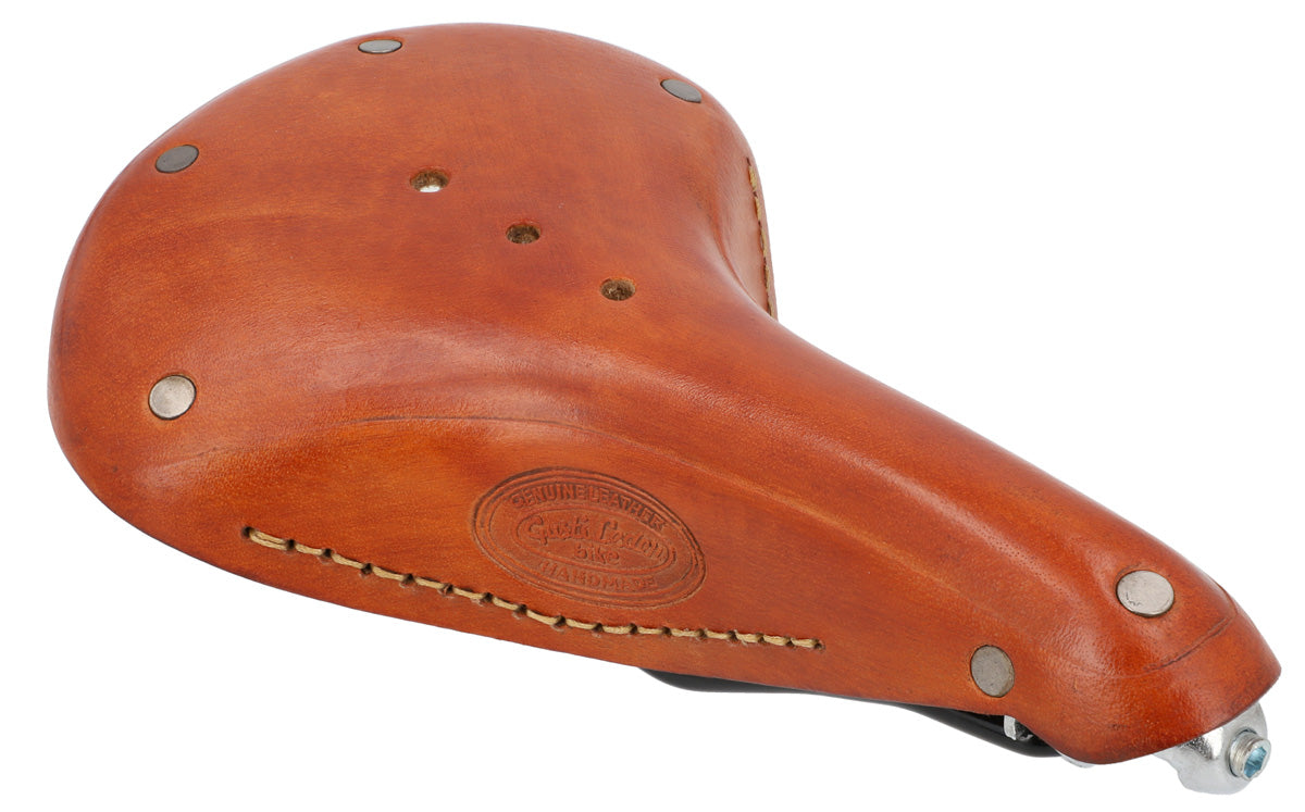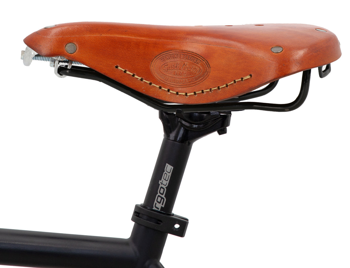 Ob Hollandrad oder Singlespeed - mit Retrosattel "Tadej P." machst du immer eine gute Figur! Sein zeitloses Design und das hochwertig verarbeitete Leder hübscht dein Fahrrad nicht nur auf, sondern zieht auch unweigerlich auf jeder Fahrradtour neidische Blicke auf sich. Aus äußerst widerstandsfähigem Büffelleder gearbeitet und umlaufend mit Nieten beschlagen bietet der Sattel durch zwei Halterösen die Möglichkeit noch eine Satteltasche zu befestigen.