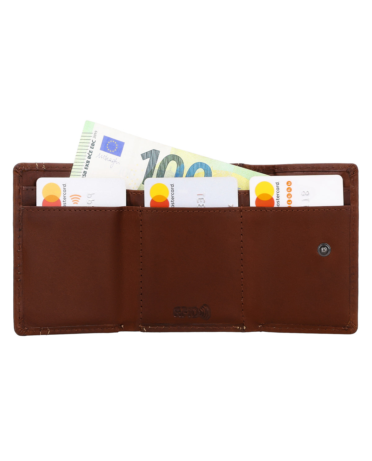Diese Geldbörse muss immer mit. Denn "Ronald" besticht nicht nur durch die unbestreitbare Funktionalität, sondern auch durch das gediegene Design. Die sichtbaren Nähte verleihen "Ronald" einen rustikalen Look Derweil verleiht das widerstandsfähige und hochwertig verarbeitete Leder dieser Börse eine tolle Formstabilität und Festigkeit. Dank integriertem RFID-Schutz sind Deine Karten zudem zuverlässig vor ungewolltem Auslesen geschützt.
