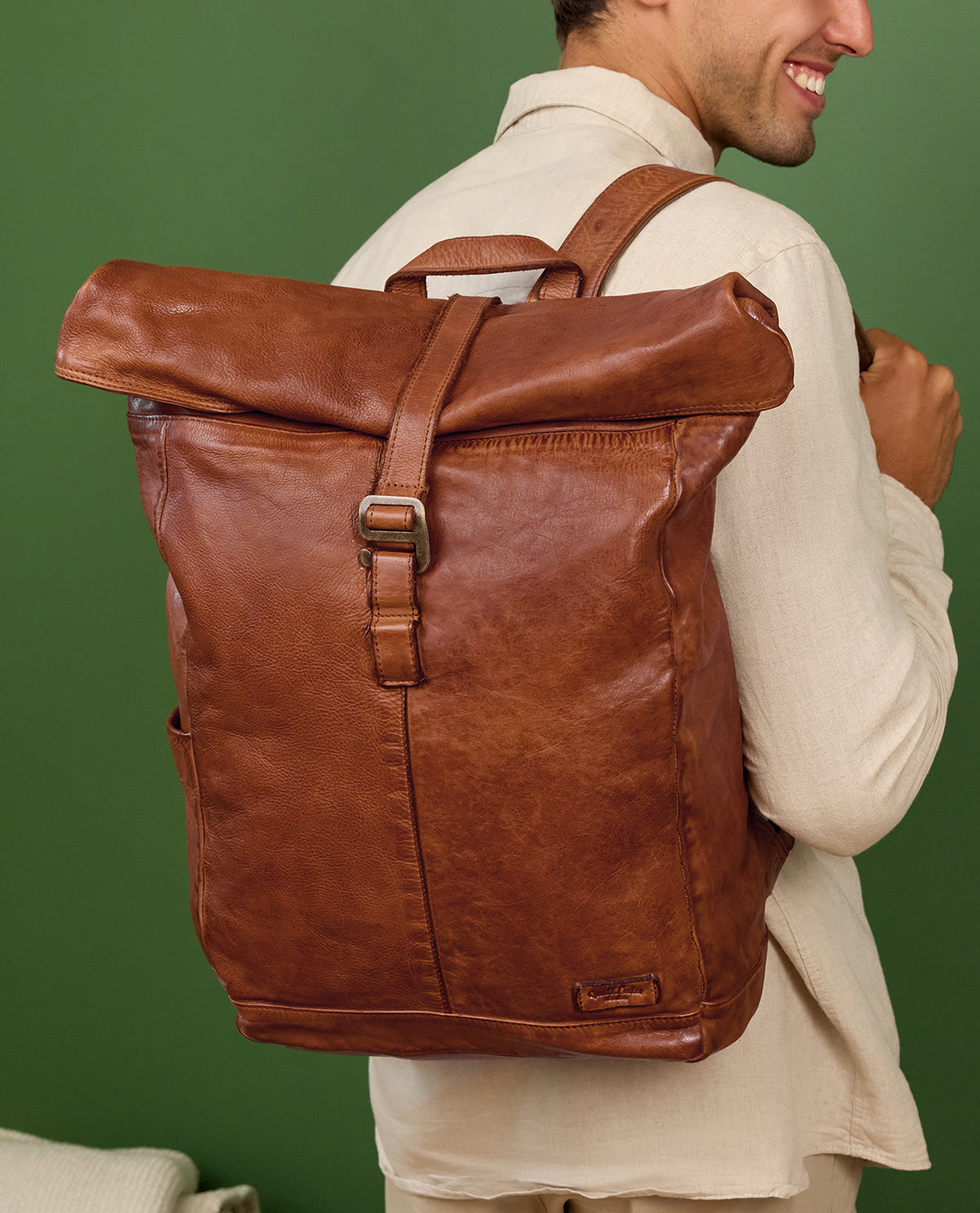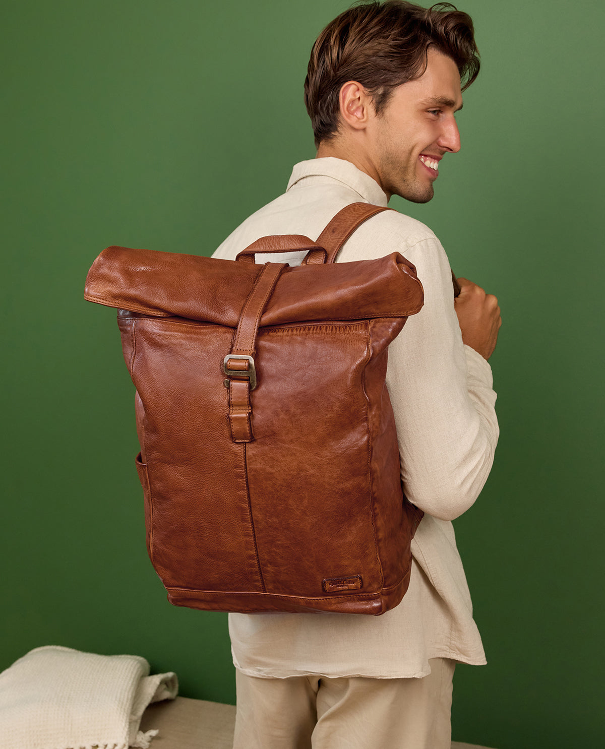 Our “Bendik” rolltop backpack is the perfect companion, no matter if you’re going to school, uni or work. He’ll win you over with his flexibility, comfort, and space. This sturdy, classic daypack made of brown leather stands out from the crowd with its trendy rolltop—a look that you just can’t ignore at the moment.