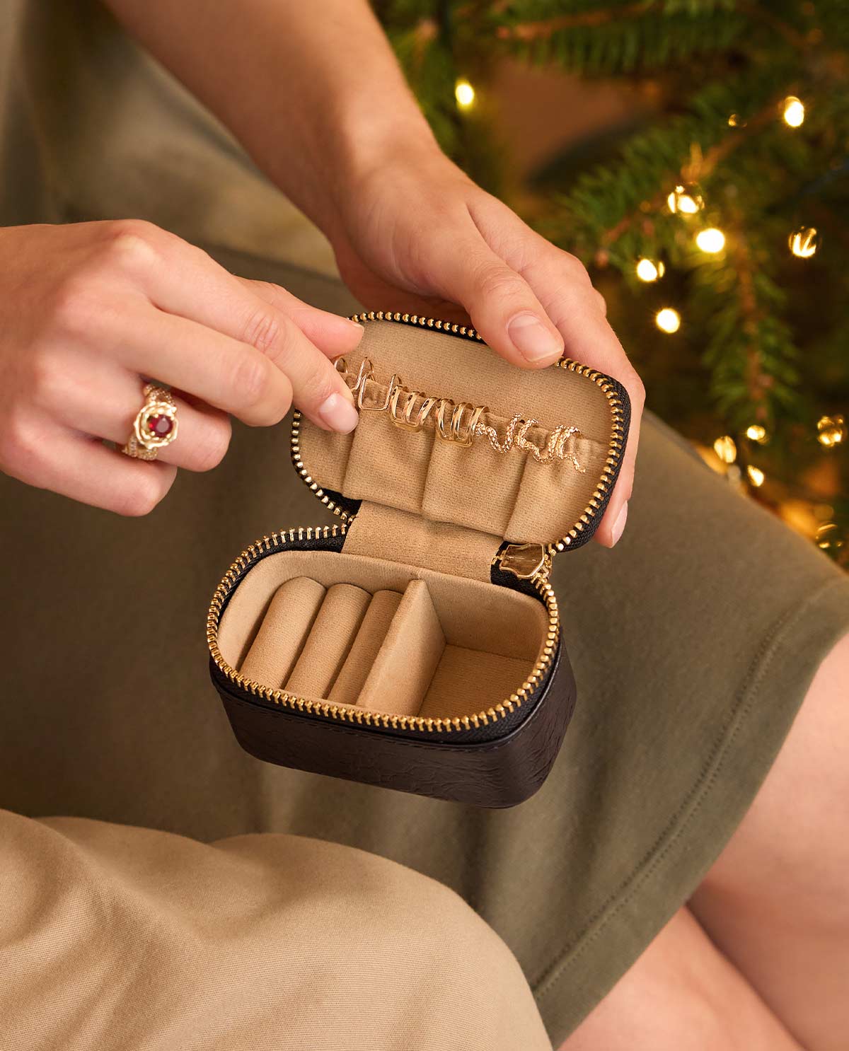 "Levke's" soft internal compartments offer you plenty of space to carefully organise your necklaces, earrings, and rings. It has separate slots so your jewellery stays in place and is always easily accessible. You can rest easy knowing that nothing will tangle or get damaged.