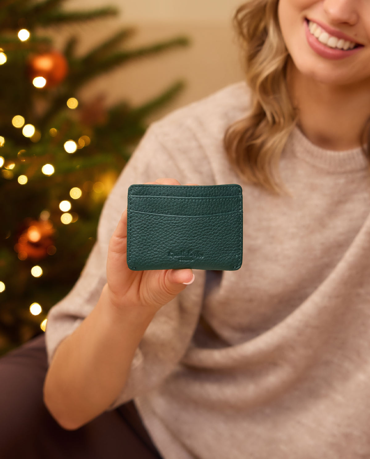 The "Qani" card case is the perfect choice for those who value organization and elegance. Made from high-quality dark green leather, it impresses with its compact size and elegant design. The noble color and fine craftsmanship make it a stylish accessory that is not only functional but also a real eye-catcher. With this card case, you always have everything important with you - and in the best quality.