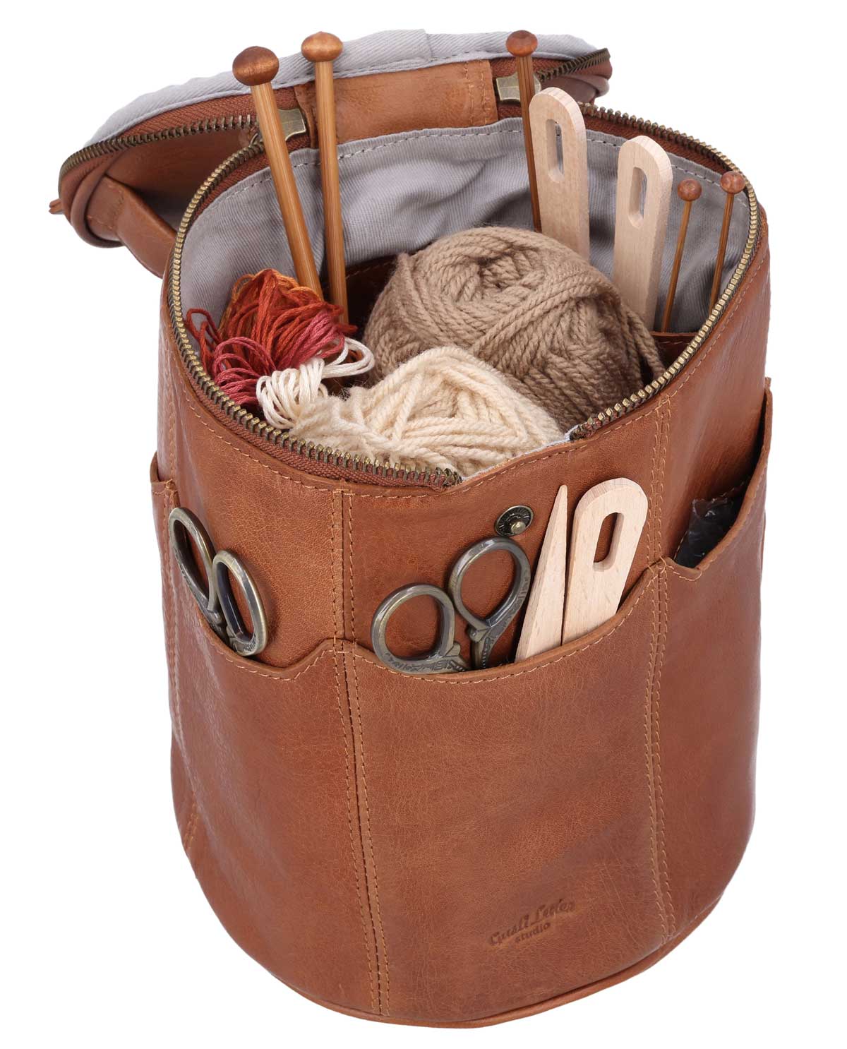 The "Corvin" is the ideal crochet bag for passionate craft enthusiasts who want to keep their tools always organized and within reach. Made from high-quality leather, it not only offers a noble and timeless appearance but also a durable structure. This knitting bag provides you with a large compartment with several smaller pockets, which are perfect for your crochet hooks, knitting needles, and small accessories. So you always have everything in its place without anything getting lost.
