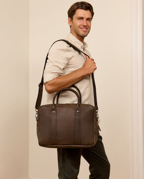 Discover this elegant laptop bag made from high-quality cowhide leather. This versatile and stylish laptop bag is perfect for both men and women. It not only offers robust and durable protection for your belongings but also adds a touch of elegance to your everyday life.