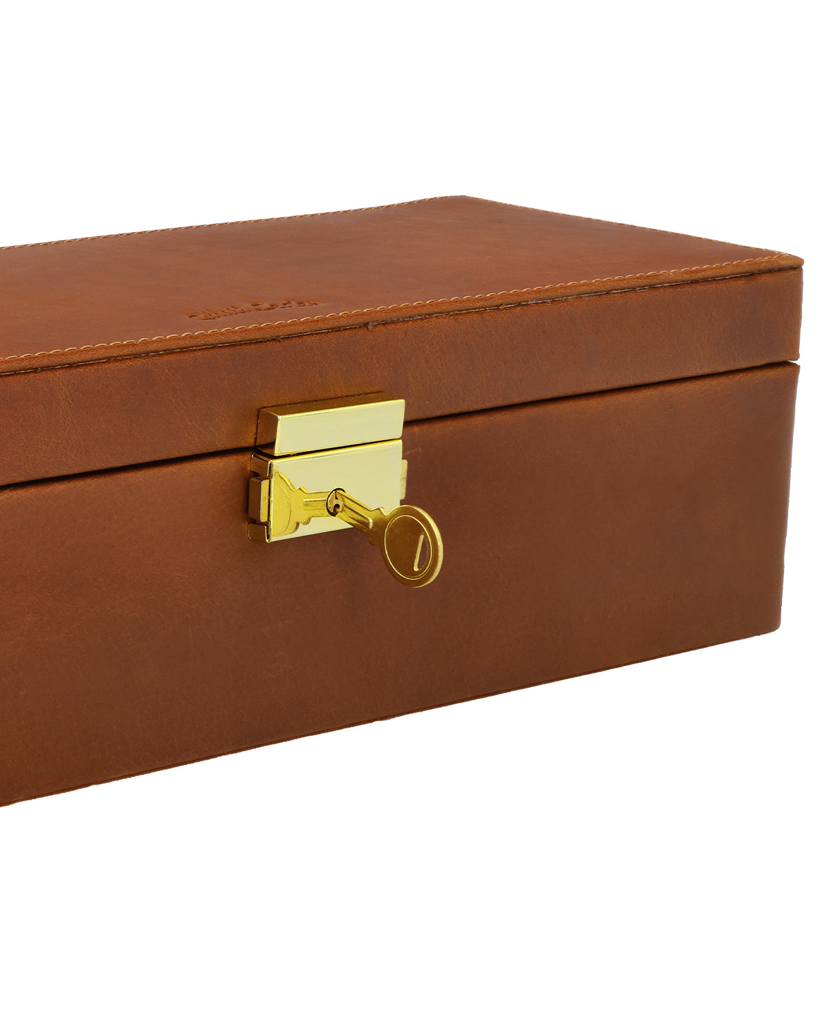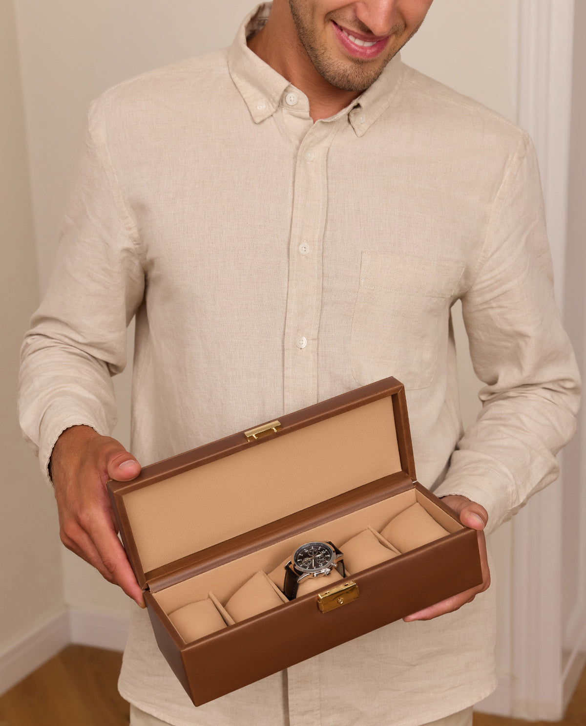 With "Marcel", you store your favorite watches safely, elegantly, and stylishly. The watch box made of high-quality leather with a smooth, noble surface combines sophisticated design with functional finesse. The luxurious exterior gives it a timeless appeal, while the soft, fabric-lined interior reliably protects your watches from scratches and dust. With its clean lines and warm leather texture, "Marcel" is not only a practical storage place but also a decorative highlight on any nightstand or shelf.
