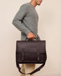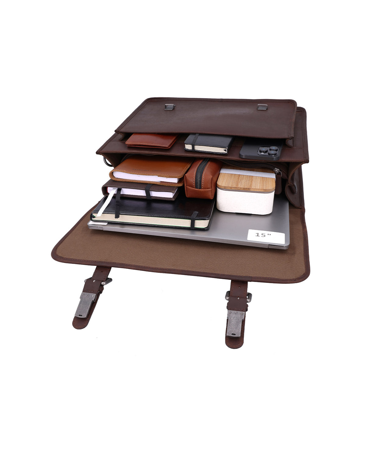 "Elmar" and its spacious, centrally divided main compartment easily accommodate DIN A4 folders and document files of all kinds, as well as the diary, writing utensils, lunch package, a small bottle of water, and more. Technical devices up to a size of 15" can meanwhile be placed in a specially integrated laptop compartment in the bag design. The centrally inserted zip compartment as well as the various slip pockets and the attached pocket on the front of "Elmar" also offer the possibility to store smaller belongings within easy reach, without having to search for them for a long time. The adjustable and detachable shoulder strap allows you to ideally adapt "Elmar" to your individual carrying habits, while two snap closures in thorn buckle look ensure that everything is protected from dust and moisture on the go.