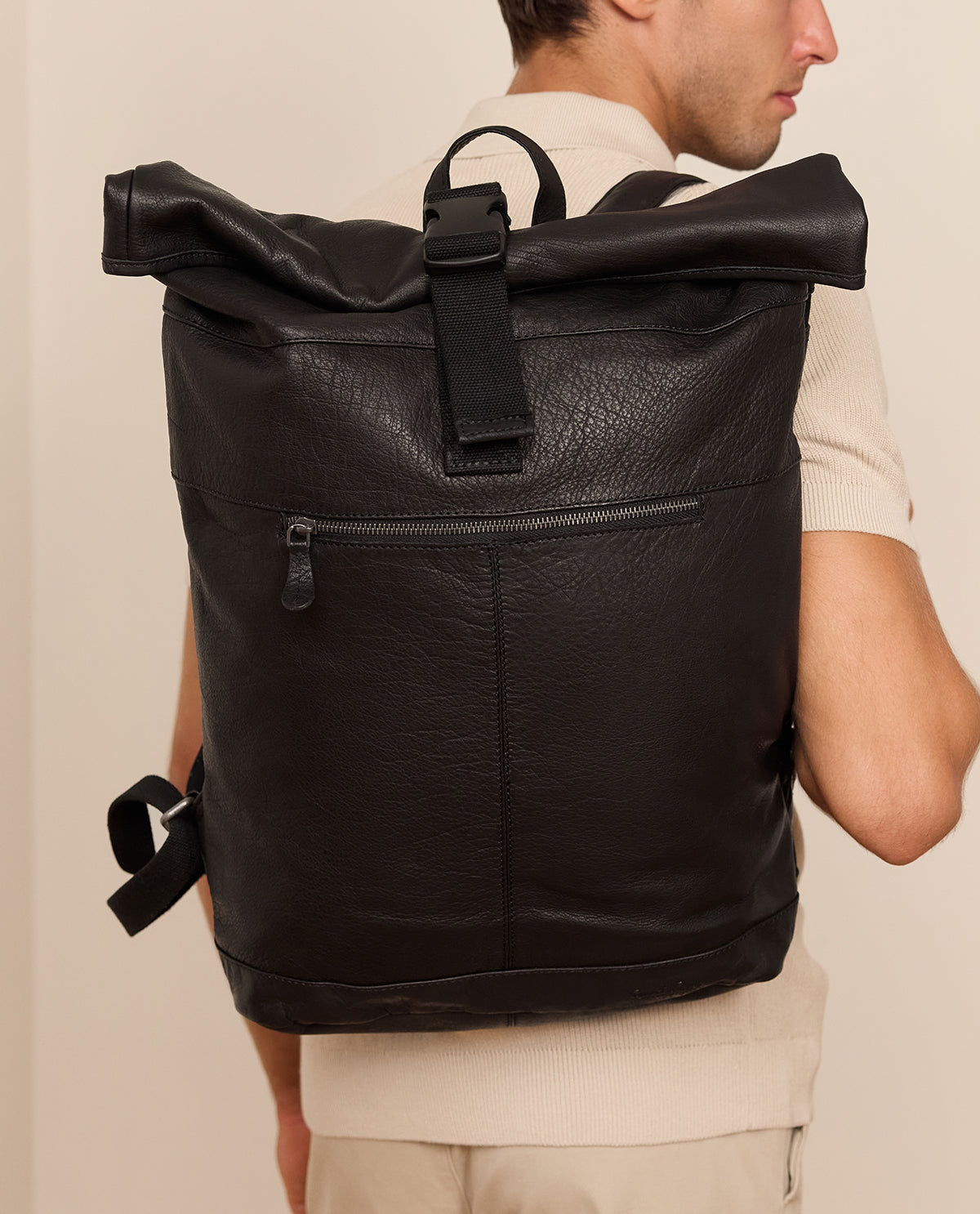 Our “Mattis” roll top backpack is the perfect companion, no matter if you're going to school, uni, or work. He'll win you over with his flexibility, comfort, and space. This sturdy, classic daypack made of black buffalo leather stands out from the crowd with its trendy roll top—a look that you just can't ignore at the moment.