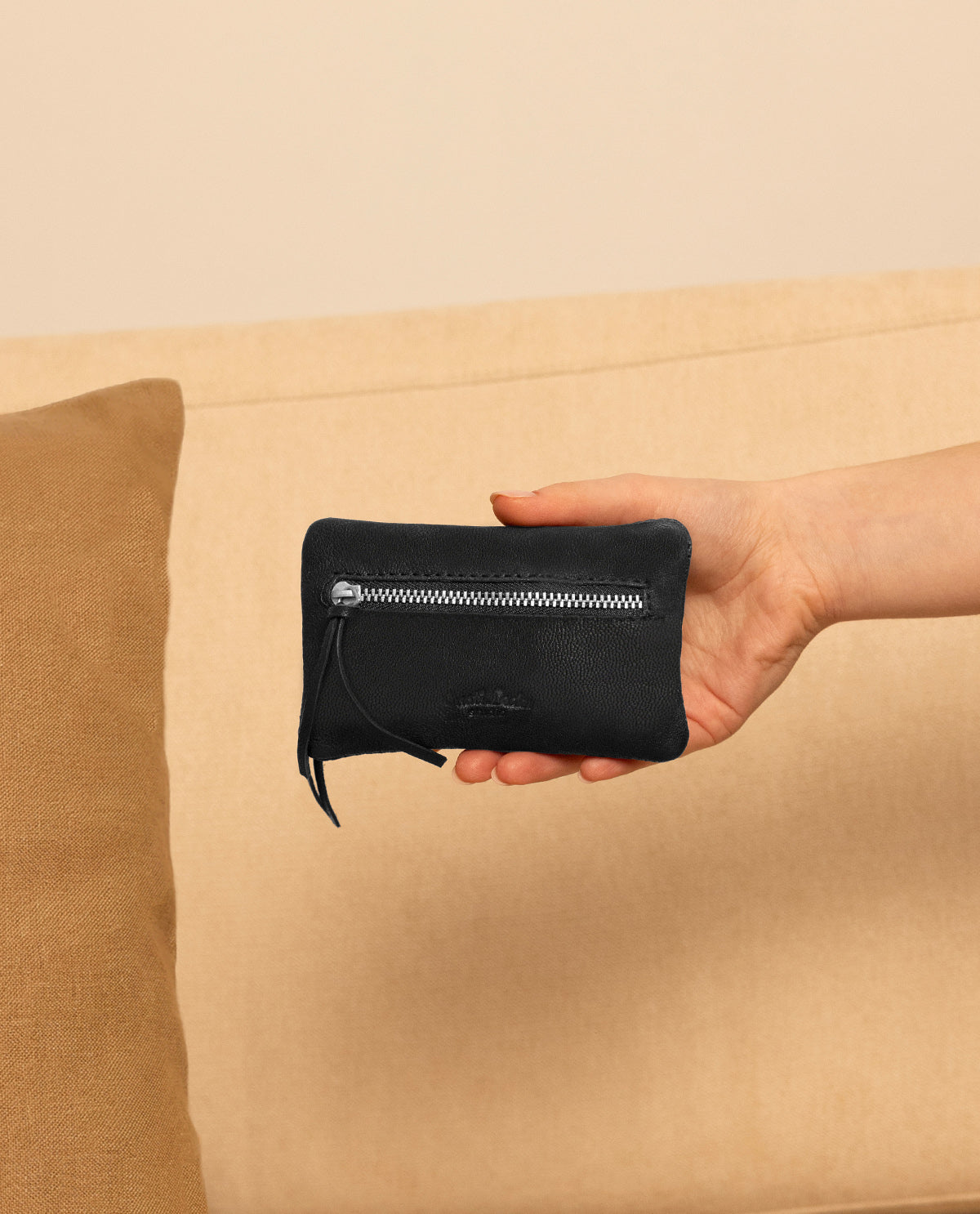 The black leather wallet stands out with its elegant and compact design. The main closure is in the middle, allowing you quick access to your cards and cash. On the back, an additional closure provides extra security. This wallet is perfect for daily use as it is both practical and stylish.