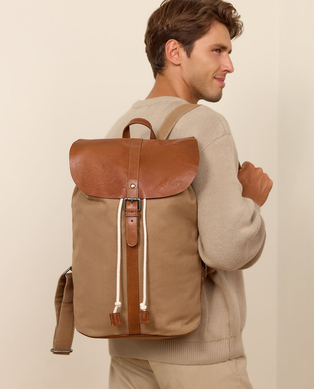 Rygsæk cityrygsæk laptoptaske læderrygsæk i beige canvas og læde
