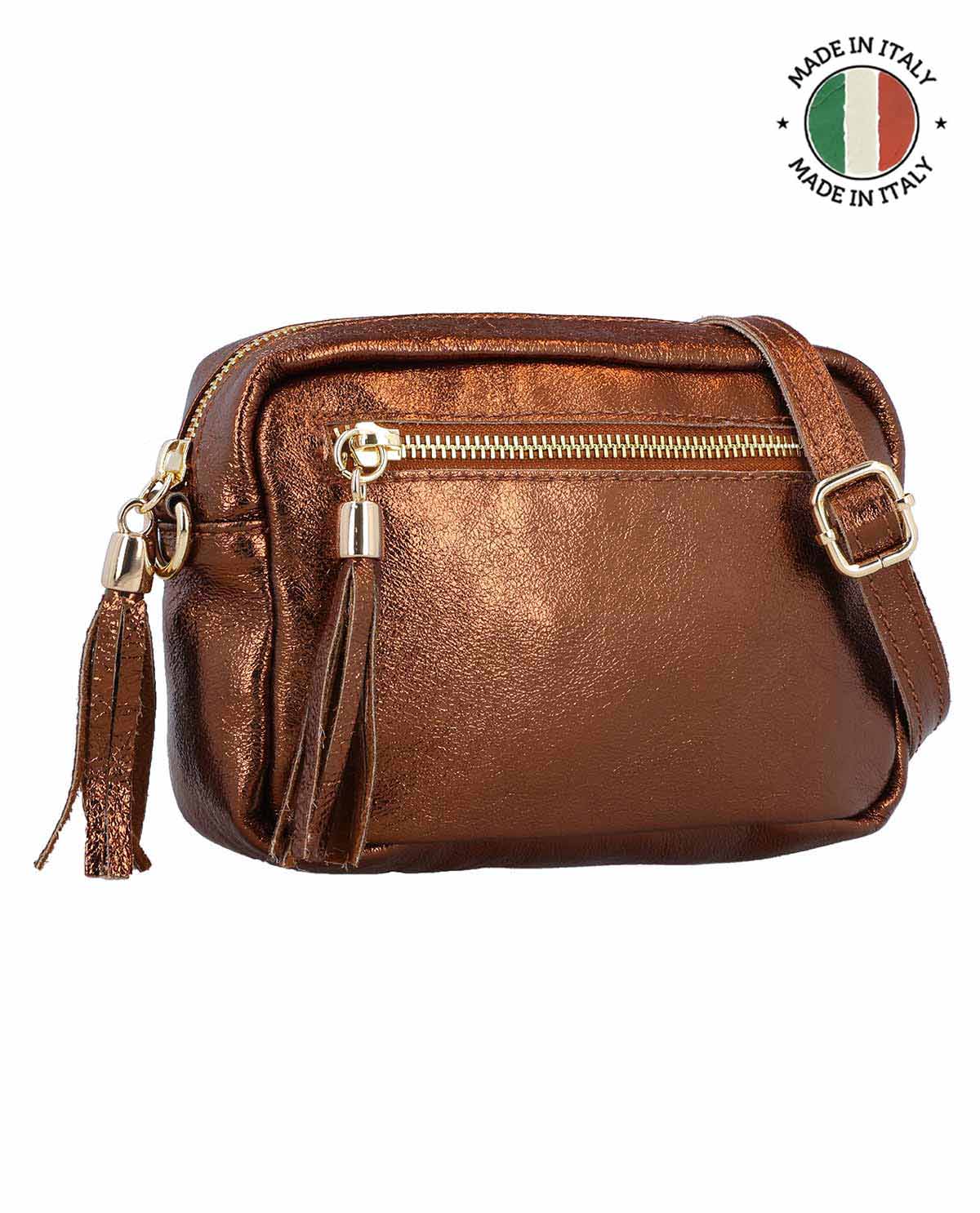"Cariba" skuldertaske i høj kvalitet læder er den ideelle følgesvend for enhver kvinde, der værdsætter stil og praktisk anvendelighed lige meget. Den sikre lynlåslukning beskytter dine værdigenstande pålideligt, mens den elegante vedhæng på lynlåsen giver tasken et særligt præg. Indeni venter et lyst, fint struktureret stofbetræk, der ikke kun ser ædelt ud, men også giver dig et klart overblik over dine nødvendigheder. Derudover finder du et diskret, fint præget "Made in Italy"-logo samt et integreret graveringspatch, der giver plads til din personlige dedikation. Således bliver "Cariba" til et tilbehør, der ikke kun er smukt, men også individuelt.