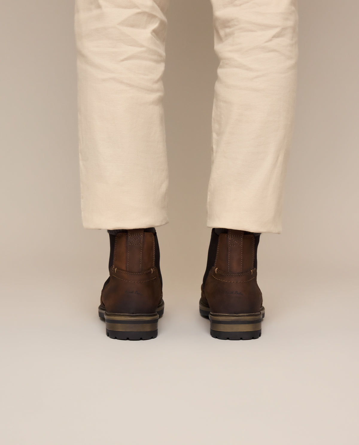 "Cedric" Chelsea-støvlerne kombinerer klassisk stil med høj kvalitet og førsteklasses komfort. Fremstillet af robust, let vintage-præget læder, imponerer de med deres naturlige struktur og elegante udseende. De elastiske, sorte sideindsatser gør det nemt at tage dem af og på, mens den dekorative vandrette søm giver skoen det lille ekstra. Den praktiske lædertrækstrop ved hælen, forstærket med en korssting, sikrer holdbarhed og gør det lettere at tage dem på, selv ved hyppig brug. "Cedric" støvlerne fås i størrelserne 40 til 45 og tilpasser sig perfekt til din fod.