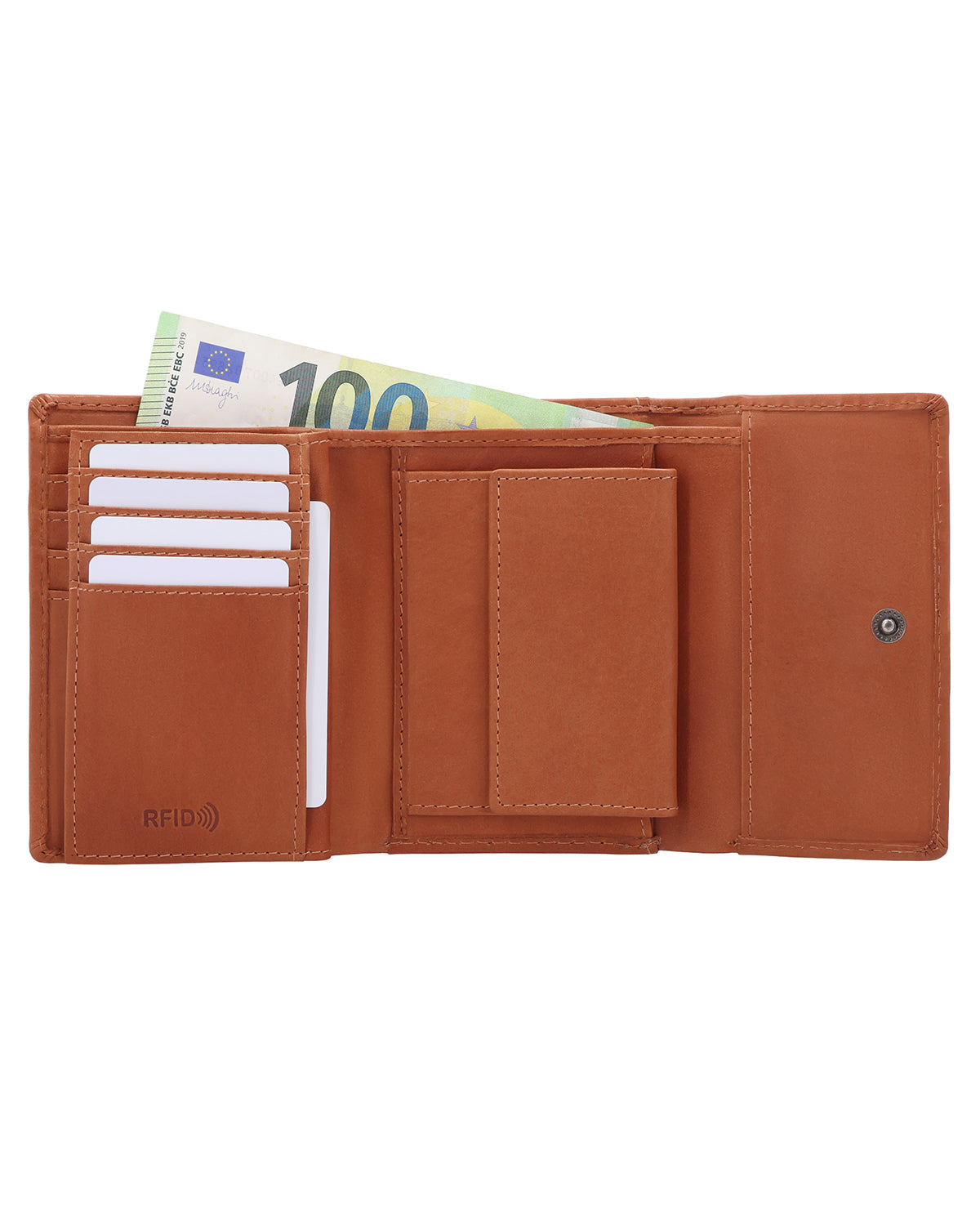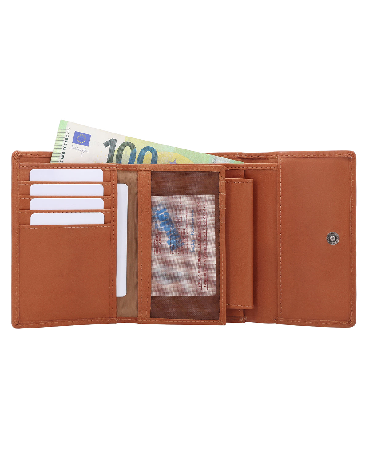 Med "Tessa" er det ikke længere noget problem at lægge byttepenge hurtigt væk ved kassen. Det tager jo alligevel lang tid at få pakket indkøbene. Uanset om du foretrækker at betale med kort eller kontanter: Alt er hurtigt ved hånden og lige så hurtigt væk igen i pungen. Vores pung er lavet af robust oksekind og kan lukkes med en trykknap. Takket være integreret RFID-beskyttelse er dine kort desuden beskyttet mod uønsket aflæsning. Til de små hverdagsøjeblikke er der også et ekstra møntrum til en enkelt mønt – perfekt, hvis du hurtigt vil have en passende mønt ved hånden. Logoet er præget på ydersiden og giver "Tessa" et endnu mere eksklusivt, rent look. På bagsiden er der endda et ekstra rum til f.eks. billetter, så du ikke behøver at lede længe i toget, når konduktøren kommer forbi. Desuden kan du finde din billet med det samme, og tiden med "Hjælp, jeg har mistet min billet"-tankerne er endelig forbi!