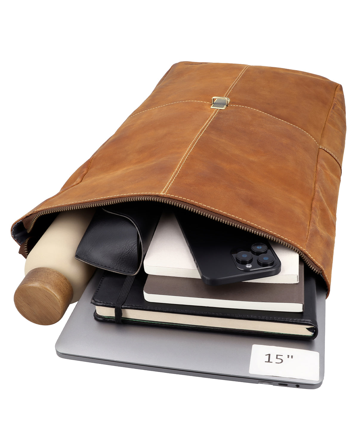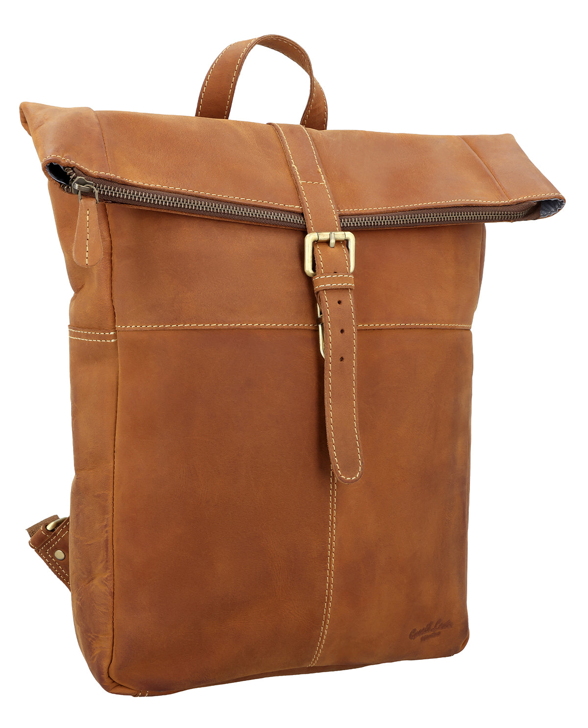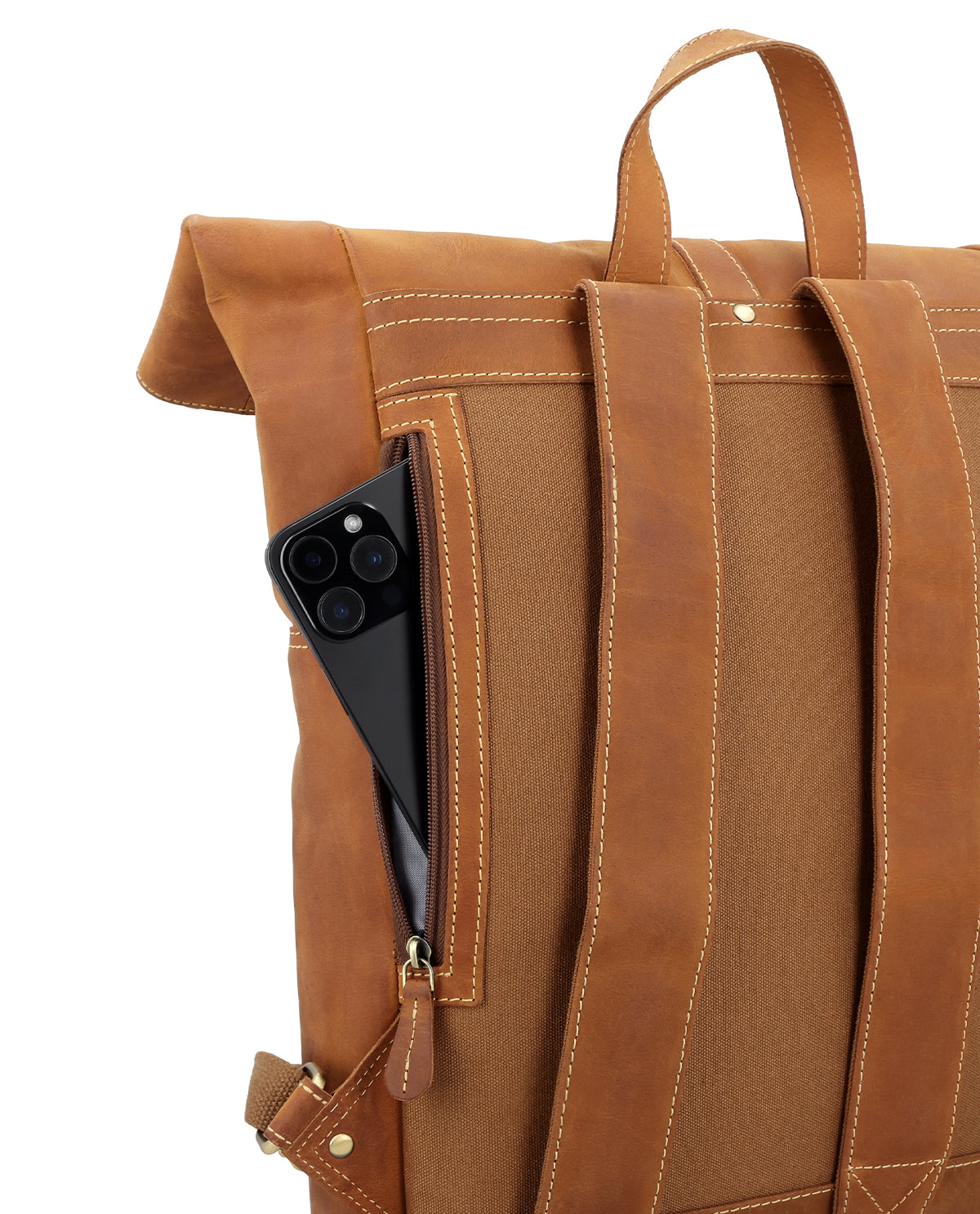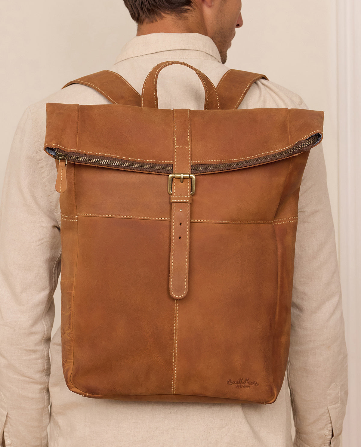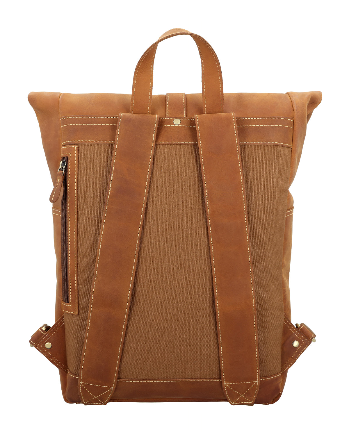 "Henning" er en mellemstor rolltop-rygsæk lavet af modstandsdygtigt bøffellæder, der med sit slanke snit er perfekt til storbyens virvar eller trængslen i S-toget i myldretiden. Den gennemtænkte opdeling giver dig tilstrækkelig plads til at opbevare dine DIN A4-dokumenter, din 15-tommer bærbar, flere bøger og en stor drikkeflaske i det rummelige hovedrum. Derudover hjælper et stiklomme og en lynlås-indvendig lomme dig med at holde dine ejendele organiseret. Skulle noget lække, beskytter det lyse indvendige stof af vandtæt polycotton læderet mod fugt og pletter. Det udvendige sidelomme med lynlås giver plads til ting, du hurtigt vil have ved hånden. Den polstrede rygdel og indersiden af de brede skulderremme er dækket med brun canvas og sikrer ekstra bærekomfort.