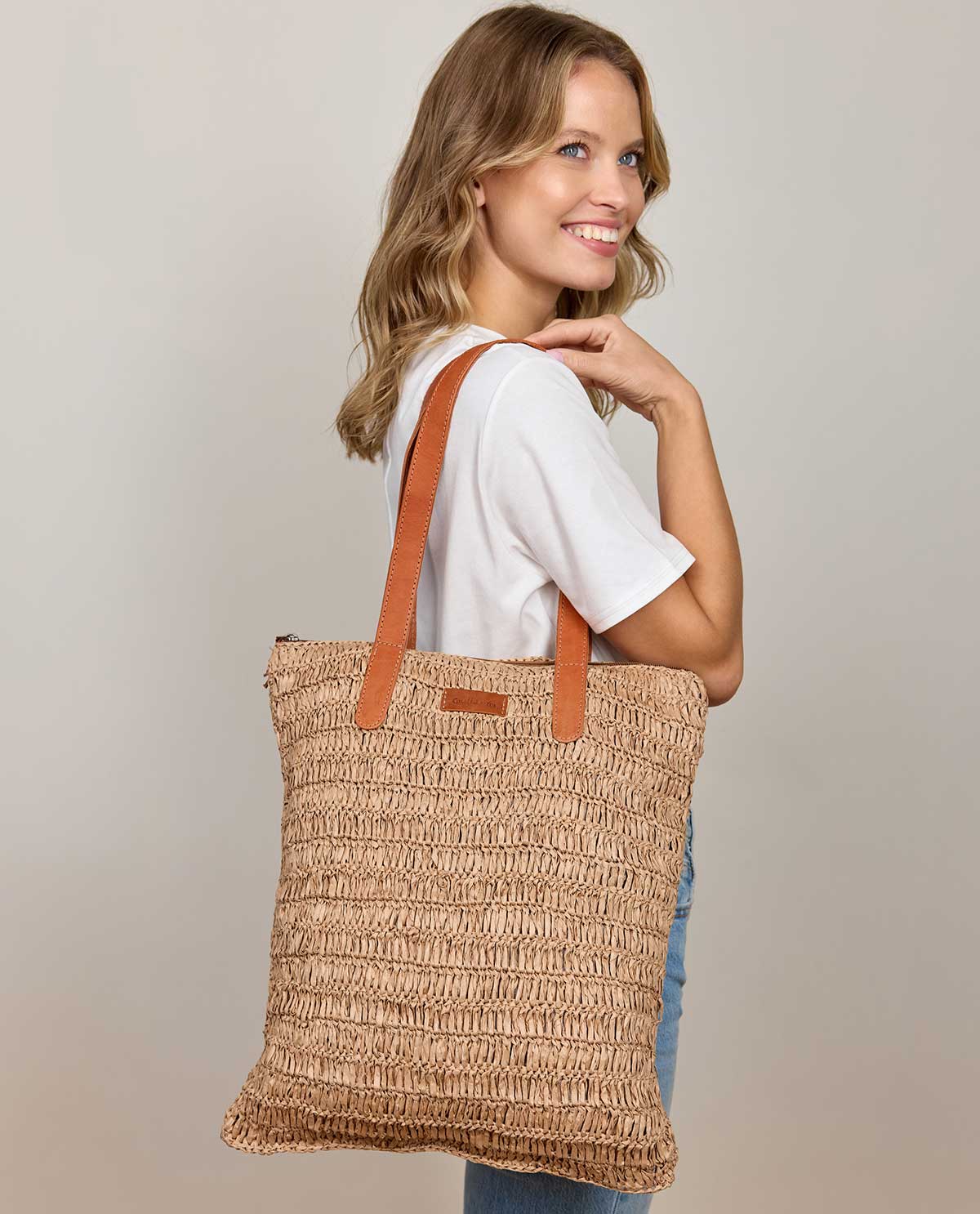 "Ceres" er den perfekte følgesvend for stilbevidste damer, der lægger vægt på bæredygtige materialer og gennemtænkt design. Som en rummelig shopper tilbyder den tilstrækkelig plads til alt, hvad du har brug for på farten - hvad enten det er til byvandring, på rejser eller som en praktisk strandtaske. Fremstillet af håndvævet raffia, imponerer den med sin fine struktur og den varme, naturlige udseende. Raffia er et naturligt, strålignende materiale, der er fremstillet af fibre fra en palme. Det er særligt let, fleksibelt og alligevel slidstærkt, hvilket gør det til et ideelt valg for stilfulde og holdbare tasker. Gennem den omfattende håndvævningsteknik bliver hver "Ceres" til et unikt stykke med en enestående struktur. Suppleret med enkle læder-bæreremme, tilbyder tasken ikke kun en stilfuld kontrast, men også høj bærekomfort.